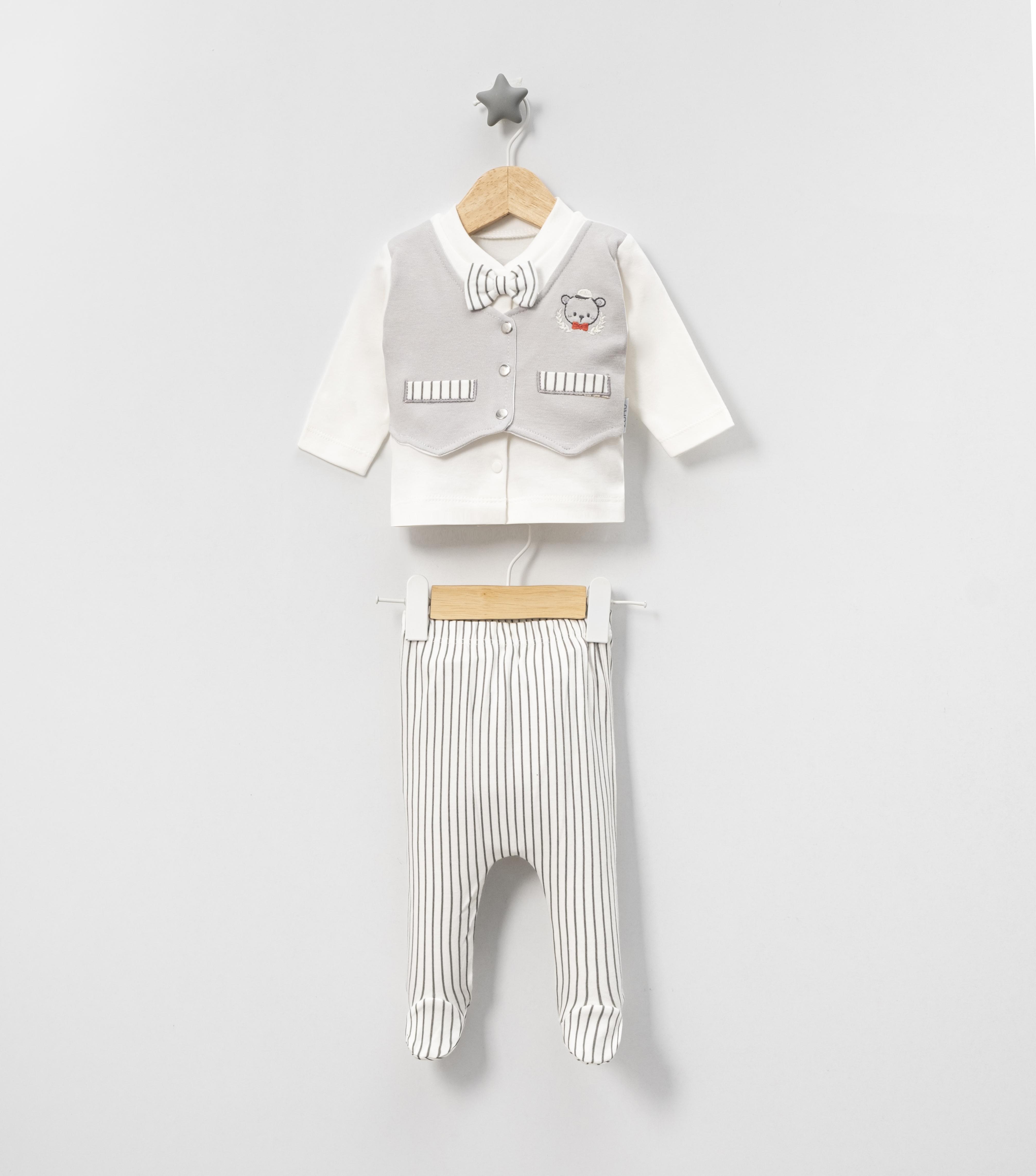 Yelekli ve papyonlu tasarımı ile bebeğiniz, hem şık hem de sevimli bir görünüm kazanacak. Göz alıcı renklere sahip olan set, baby shower gibi özel etkinliklerde de mükemmel bir hediye seçeneği olacaktır.
